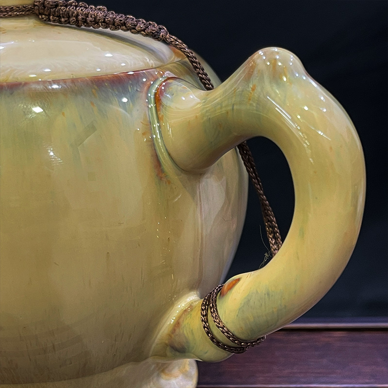 Lớp men hỏa biến vàng kem tạo nên chiều sâu thị giác nhờ hiệu ứng chuyển màu tự nhiên. Dưới nhiệt độ nung cao, men loang nhẹ và ngẫu hứng, tạo thành những mảng màu vàng ấm pha nâu sẫm ở rìa, khơi gợi cảm giác gần gũi và thư giãn. Lớp men hỏa chuyển sắc không ngừng giúp mỗi bộ ấm chén mang nét riêng khó sao chép, giàu giá trị thẩm mỹ và ý nghĩa sưu tầm.